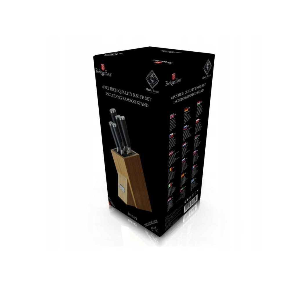 1x dao đầu bếp 34 cm||- 1x dao bánh mì có răng cưa 31,5 cm||- 1x dao thịt 28 cm, ||- 1x dao đa năng 20,5 cm||- 1x thép mài 36 cm |