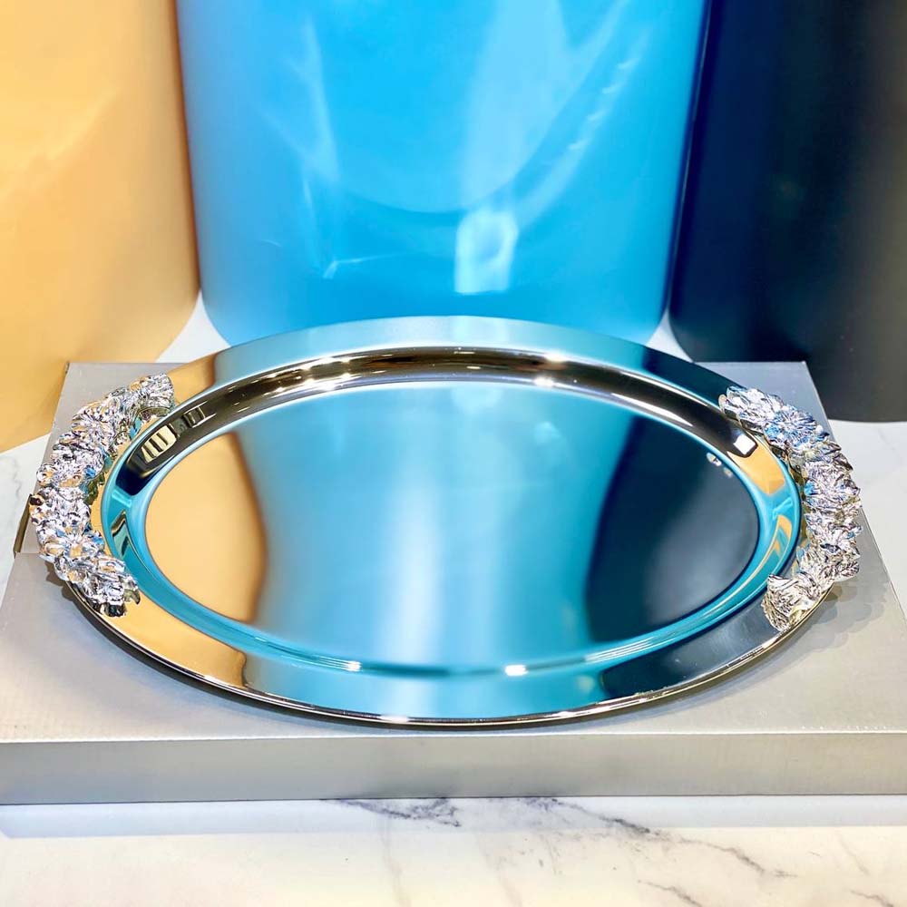 Khay decor viền trạm khắc hoa hình oval màu bạc